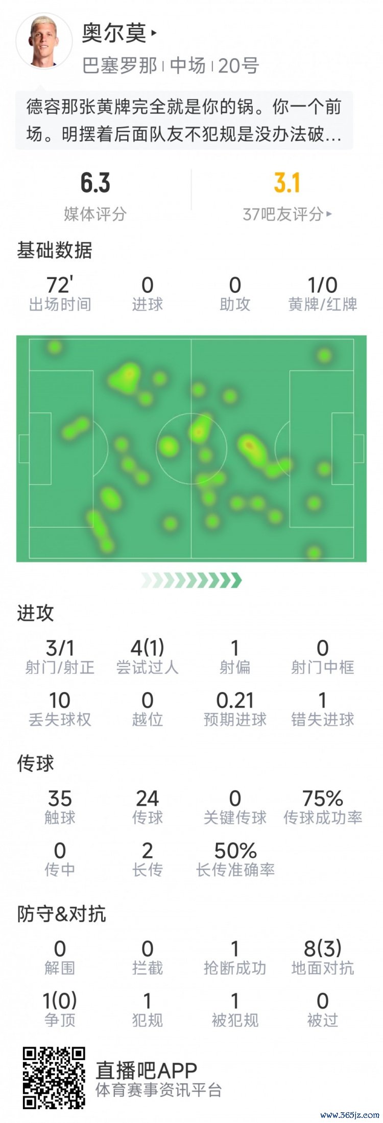 奥尔莫本场数据:3射1正,1次失良机,4次过东说念主1次告成,1次抢断