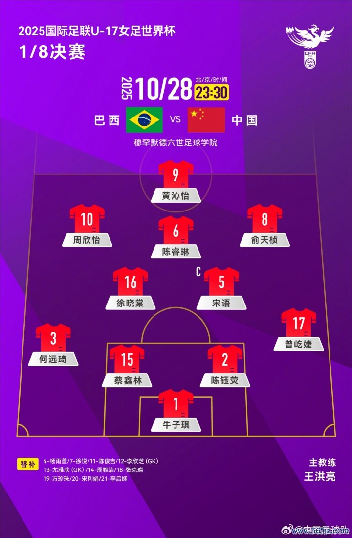 寰球杯1/8决赛!U17女足vs巴西首发:周欣怡、宋语先发