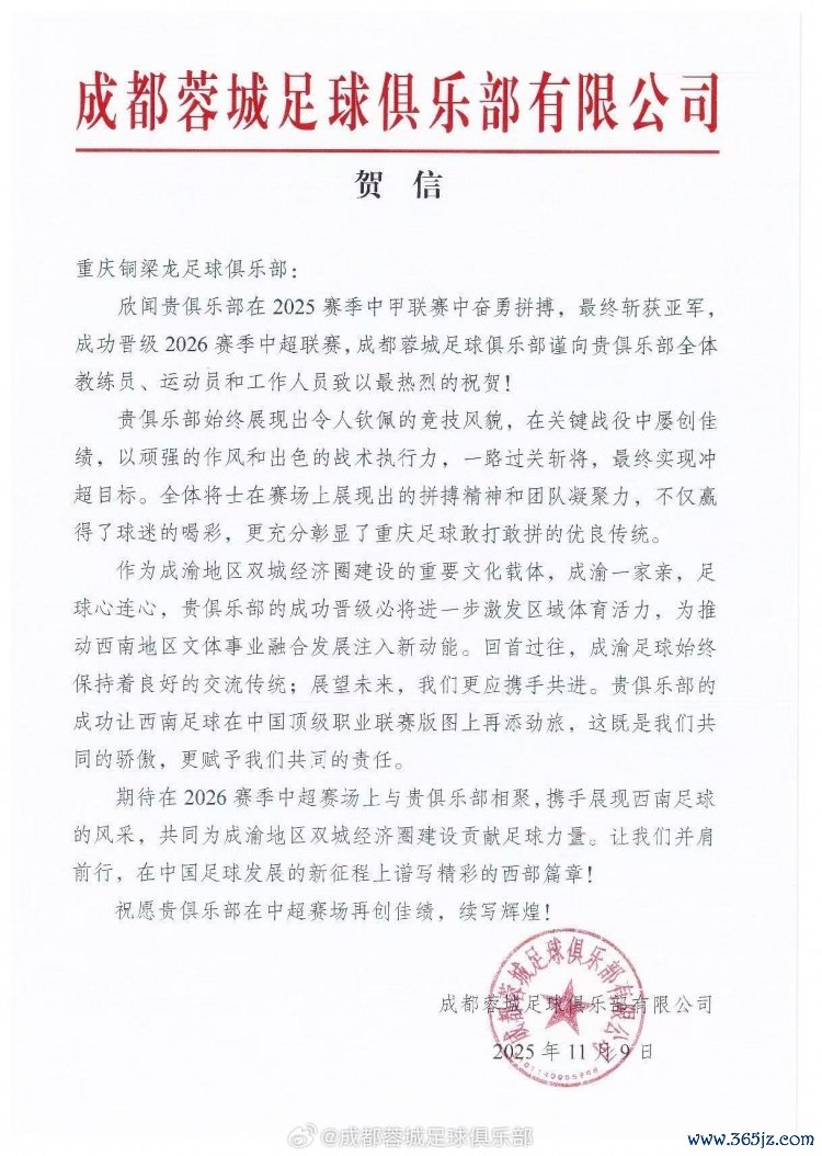 欣闻贵俱乐部在2025赛季中甲联赛中起劲拼搏,最终斩获亚军,得胜晋级2026赛季中超联赛,成王人蓉城足球俱乐部谨向贵俱乐部合座教唆员、开通员和使命主说念主员致以最激烈的祝福!