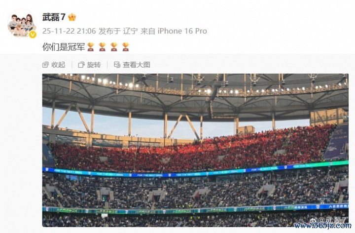 11月22日讯 海港夺得2025中超冠军几小时后,武磊在个东谈主微博发布动态。
