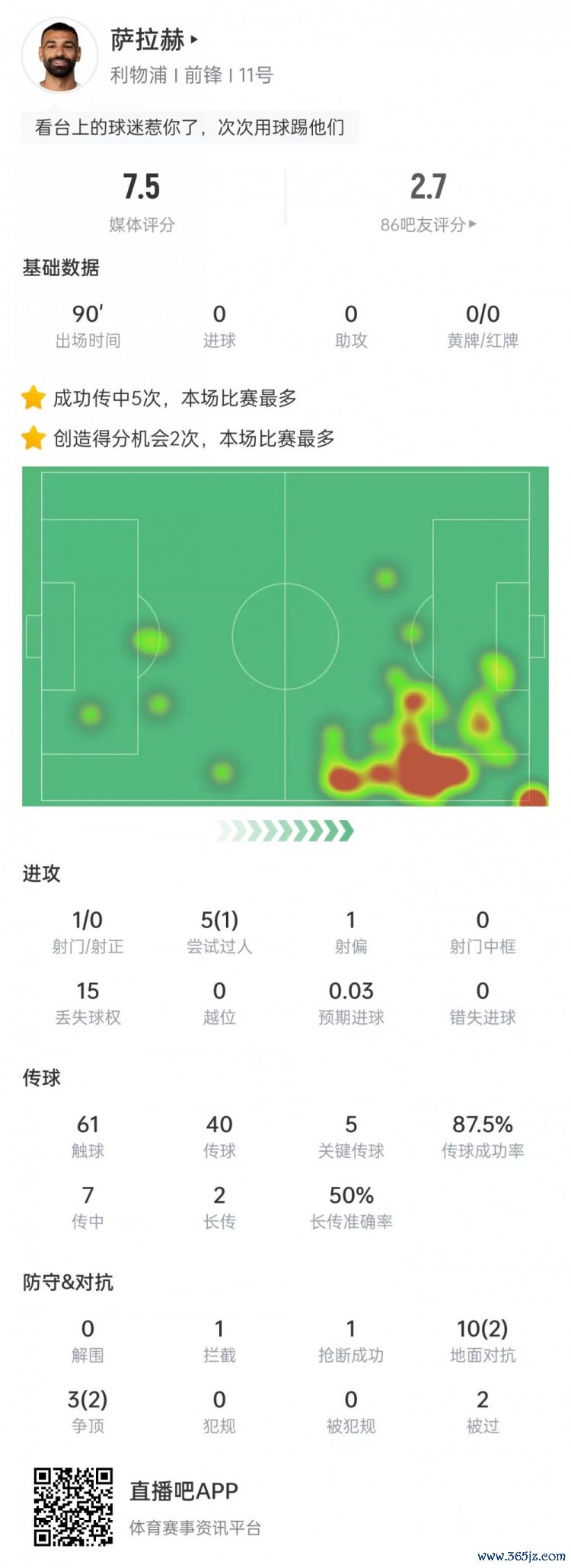 萨拉赫本场数据:5次过东谈主1次见效,5次关节传球,获评7.5分