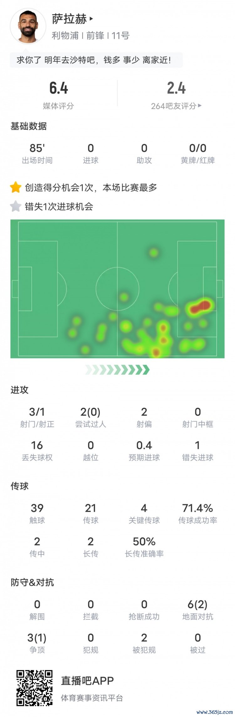 利物浦球员萨拉赫的全场数据方面,3次射门1次射正,2次过东说念主沿途失败,传球获胜率71.4%,1次错失进球,丢失球权16次。