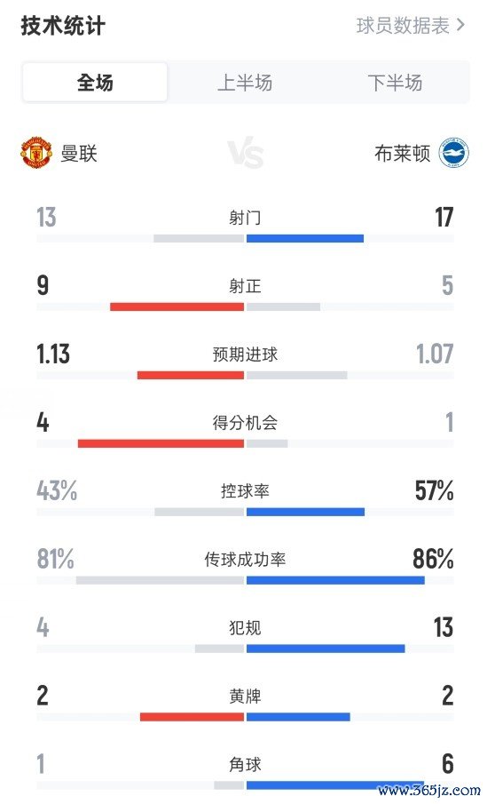 曼联4-2布莱顿全场数据:射门13-17,射正9-5,控球率43%-57%