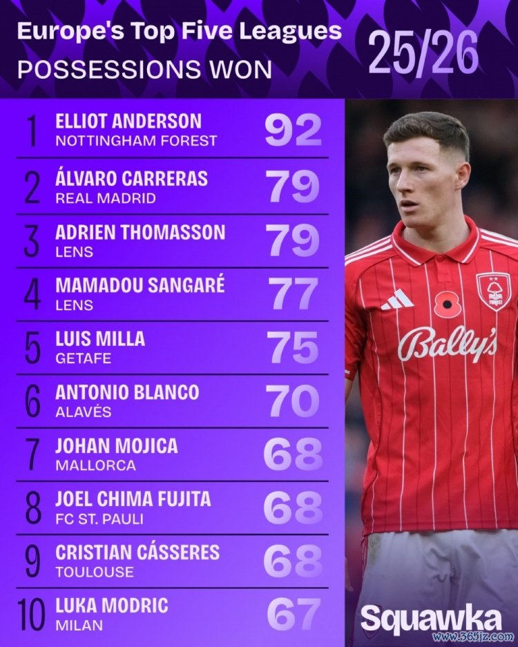 11月22日讯 五大联赛战火行将重燃,数据机构squakwa也统计了本赛季于今的五大联赛球员得到球权次数情况,诺丁汉丛林中场埃利奥特·安德森居首。