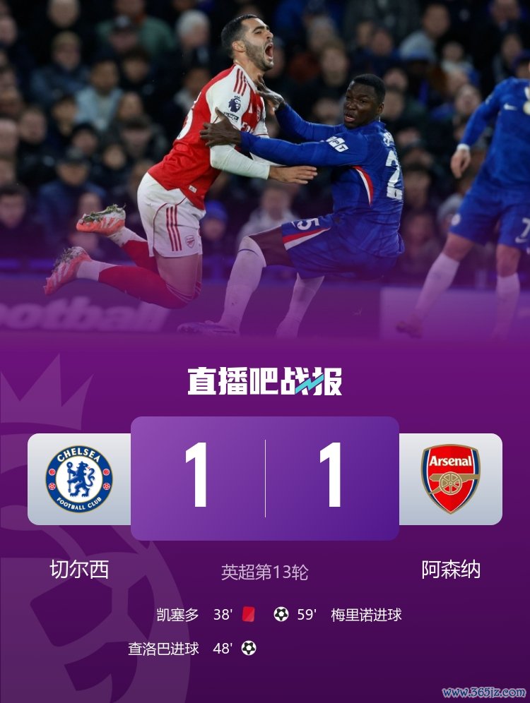 英超第13轮,切尔西与阿森纳1-1战平。本场战况利害,两边多东谈主染黄,凯塞多直红离场。查洛巴、梅里诺区别为两边破门。