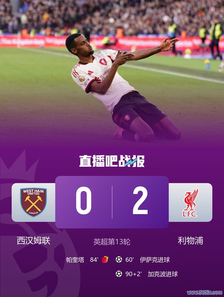 英超第13轮,利物浦2-0客胜西汉姆斥逐了近期的连败,伊萨克和加克波立功,帕奎塔抗议判罚连吃两黄被罚下场。