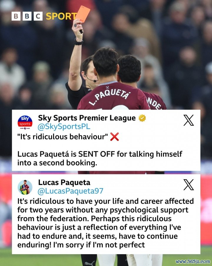 对阵利物浦的比赛连吃两黄被罚下后,西汉姆中场帕奎塔更新了个东谈主社媒,对我方不郑重的发达进行了修起。