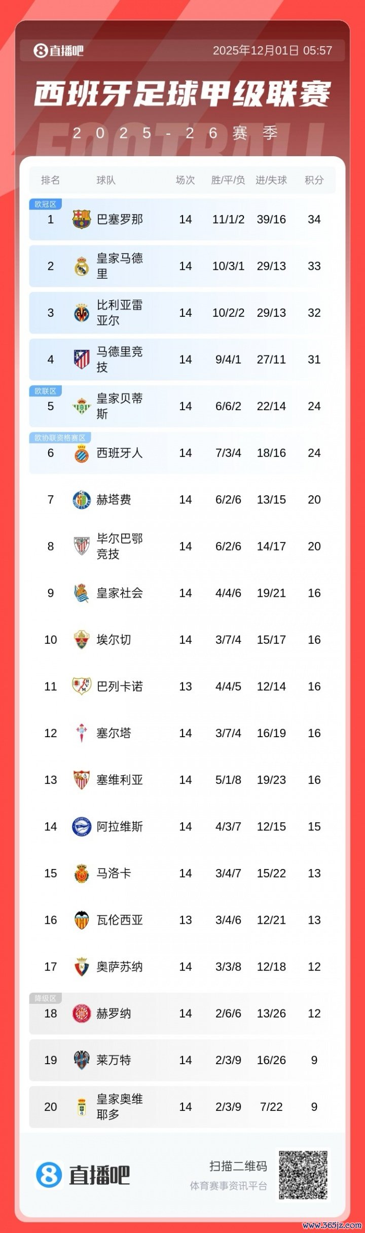 西甲积分榜方面,本轮皇马战平巴萨胜仗,巴萨1分上风领跑积分榜。