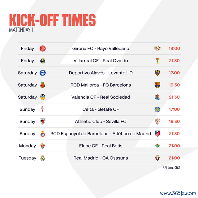 2025/26赛季西甲联赛终于到来,第一轮将是抓续五个夜晚的足球盛宴,从北京时刻8月16日星期六抓续至8月20日星期三。在此本事,西甲球迷每天齐大要不雅看到精彩的对决,尤其是巴塞罗那客场对阵马略卡和皇家马德里主场迎战奥萨苏纳的比赛,这关于上赛季西甲前两名球队来说蕴含挑战。