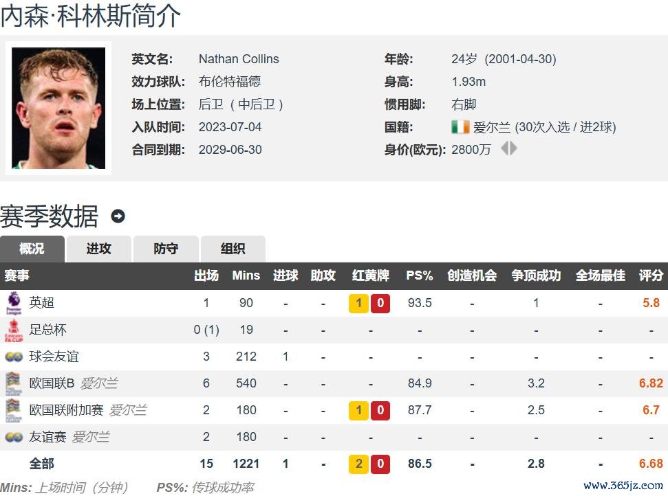 科林斯现年24岁,身高1.93米,右脚中卫,与布伦特福德的条约至2029年,德转估价2800万欧元,上赛季英超全勤,出场38次,沿途首发,孝敬2球3助。