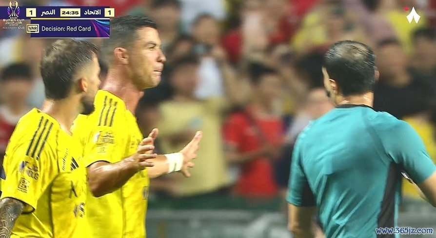 利雅得胜利也不得不在剩余泰半场本事少打1东说念主,40岁的C罗冲击赛季首冠,再次遭逢紧要打击。
