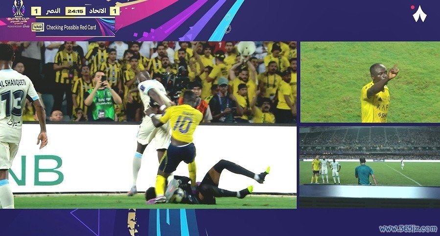 第24分钟戏剧性一幕出现了,吉达衔接后卫佩雷拉将球护球给门将,成果马内从后纠缠,临了伸脚踩到吉达衔接门将沙奇迪的肚子。一运行,主裁只是出示黄牌,但随后VAR介入,主裁最终将黄牌改成红牌。