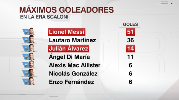 斯卡洛尼执教下阿根廷队得分 榜: 梅西51球第一, 阿尔瓦雷斯第三