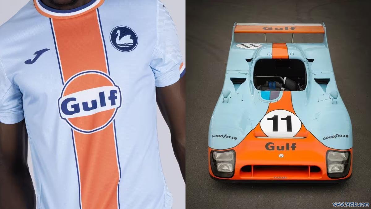 这款球衣打算以蓝色为底色,中间有一条橙色条纹,效法了海湾石油公司援手的一些经典赛车的打算,举例福特GT40、保时捷917和迈凯伦F1 GTR。球衣中央印有“Gulf”鲜艳,而队徽则罗致了相沿版块,意在呼应90年代斯旺西所穿的球衣形态。