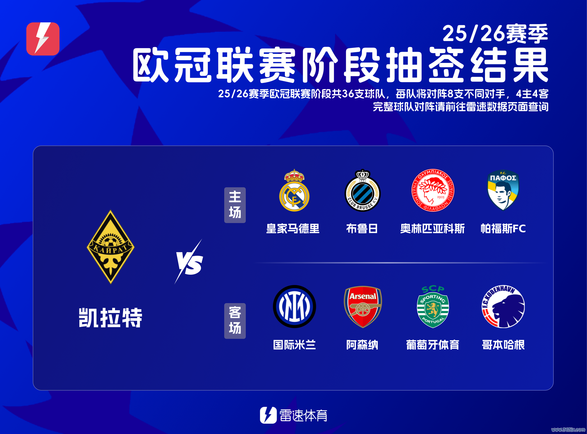 雷速体育8月28日讯 25/26赛季欧冠联赛阶段抽签服从出炉,初次进入正赛的哈萨克斯坦球队凯拉特要濒临的8个敌手一起详情,其中将主局势对皇马。