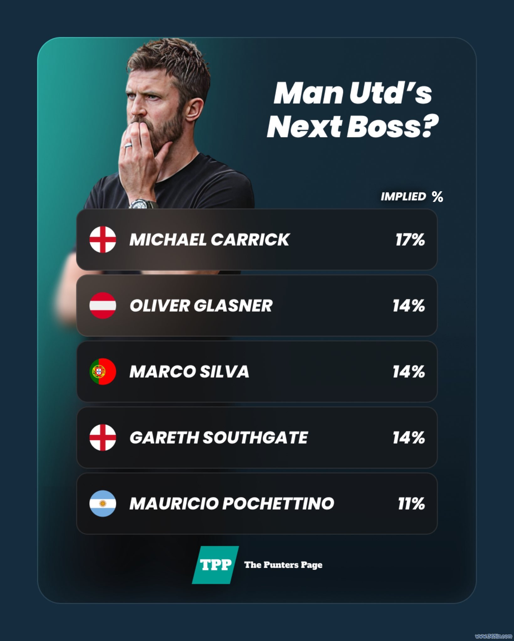 排在格拉斯纳之后的是前英格兰队主西席索斯盖特,赔率5/1,但他最近强调近期莫得重返足坛的瞎想。波切蒂诺和皆达内的赔率都是15/2,但东说念主们服气两东说念主不会执教曼联,波帅正指导好意思国备战来岁原土举办的寰宇杯,而皆祖十分哀怜我方的好名声。