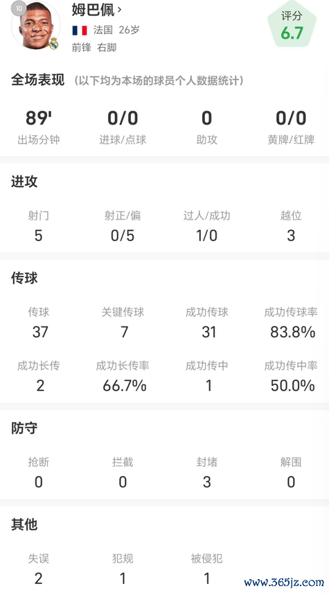 姆巴佩战马略卡全场数据:射门5次进0球,越位3次