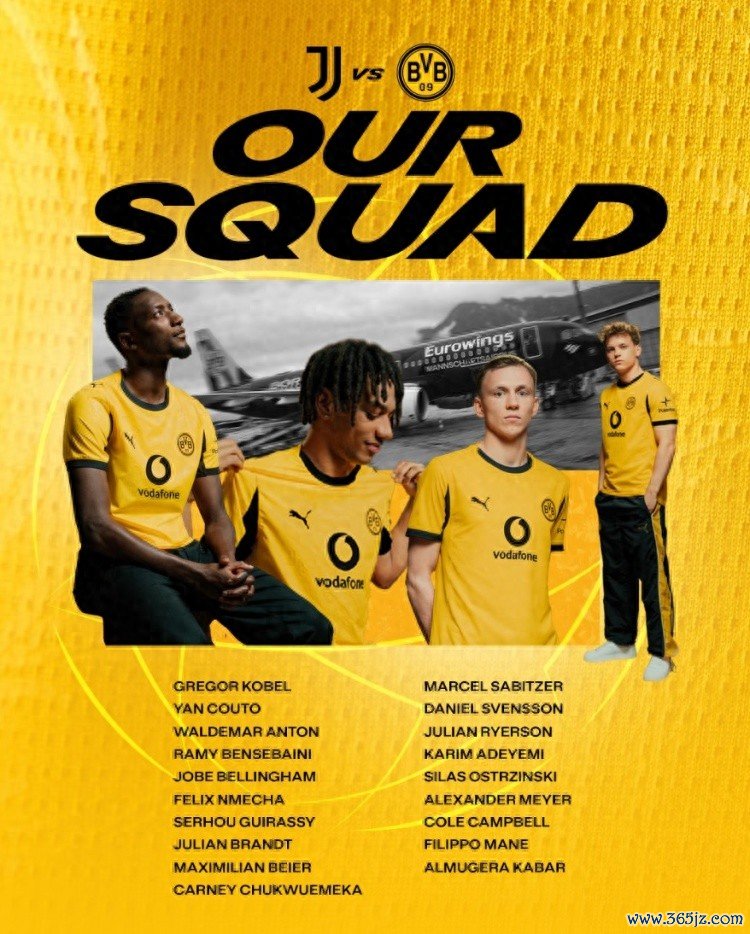 直播吧9月15日讯 欧冠联赛阶段首轮比赛,多特将前去客场挑战尤文。现在,“大黄蜂”照旧公布了本场比赛大名单,小贝林厄姆、萨比策在列,埃姆雷-詹、施洛特贝克等缺阵。