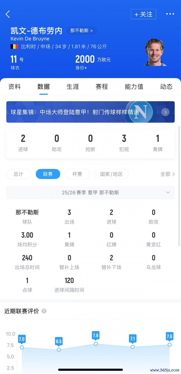 34岁的德布劳内也在本年夏天登陆意甲,他加盟那不勒斯后出战3轮意甲打进2球,匡助卫冕冠军3连胜领跑意甲。