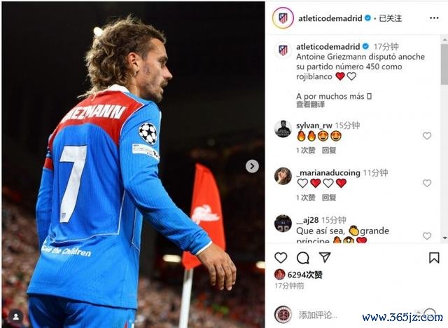 马竞官方晒出格列兹曼的相片,阐发此役是他为马竞出战的第450场比赛,格列兹曼为马竞孝顺198球93助,随队获取1次西超杯冠军、1次欧联杯冠军、1次欧超杯冠军。