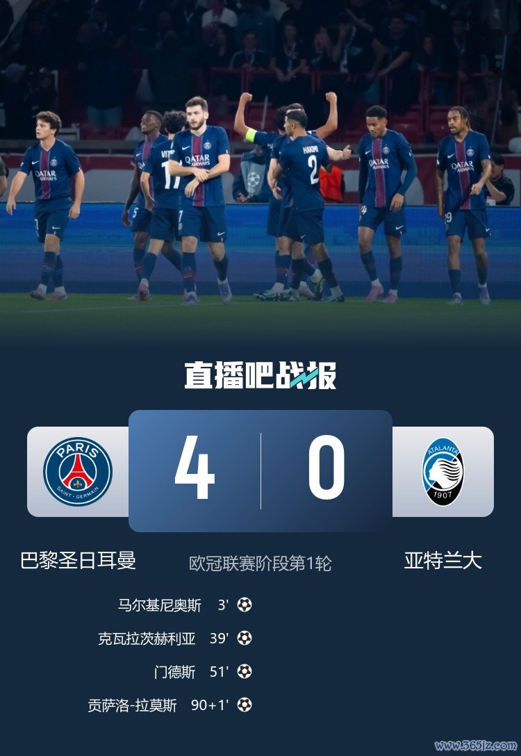 直播吧9月18日讯 北京技艺9月18日03:00,欧冠联赛阶段第一轮巴黎迎战亚特兰大的比赛在王子公园球场进行,上半场马尔基尼奥斯闪击平直,K77远射扩大比分,马尔基尼奥斯造点巴尔科拉失点,下半场门德斯破门扩大比分,拉莫斯替补立功,最终巴黎4-0亚特兰大取得开门红。