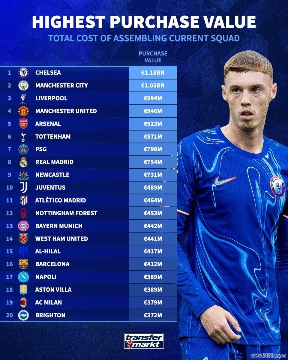 德转列足坛各队建队本钱排名:切尔西11.8亿欧领跑,曼城次席