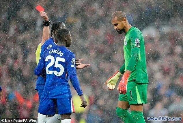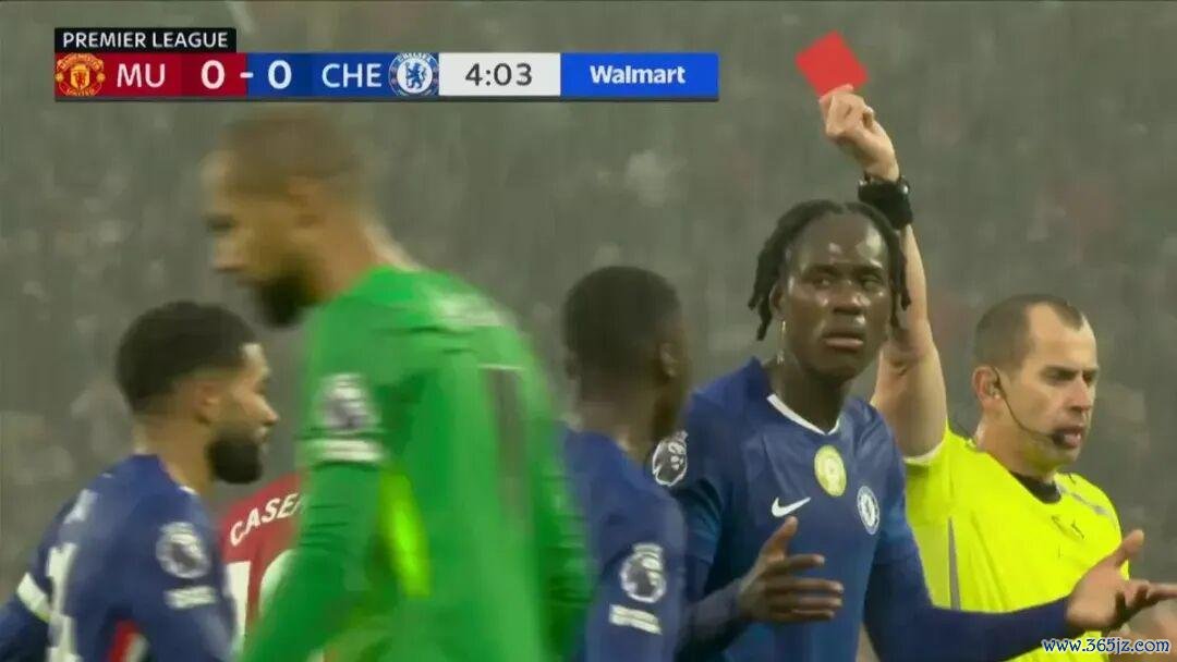 卡塞米罗此前已对恩佐·费尔南德斯犯规吃到黄牌,上半场补时阶段又因拉倒安德烈·桑托斯领到第二张黄牌,被罚下场。