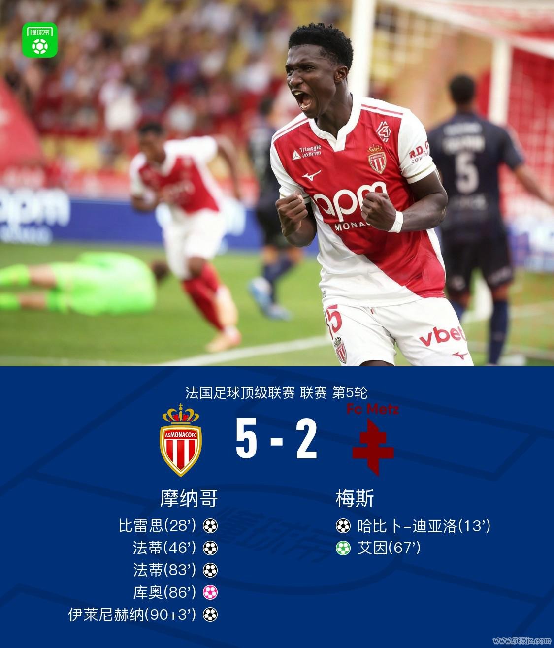 第83分钟,梅开二度,法蒂抢点头球破门,摩纳哥3-2