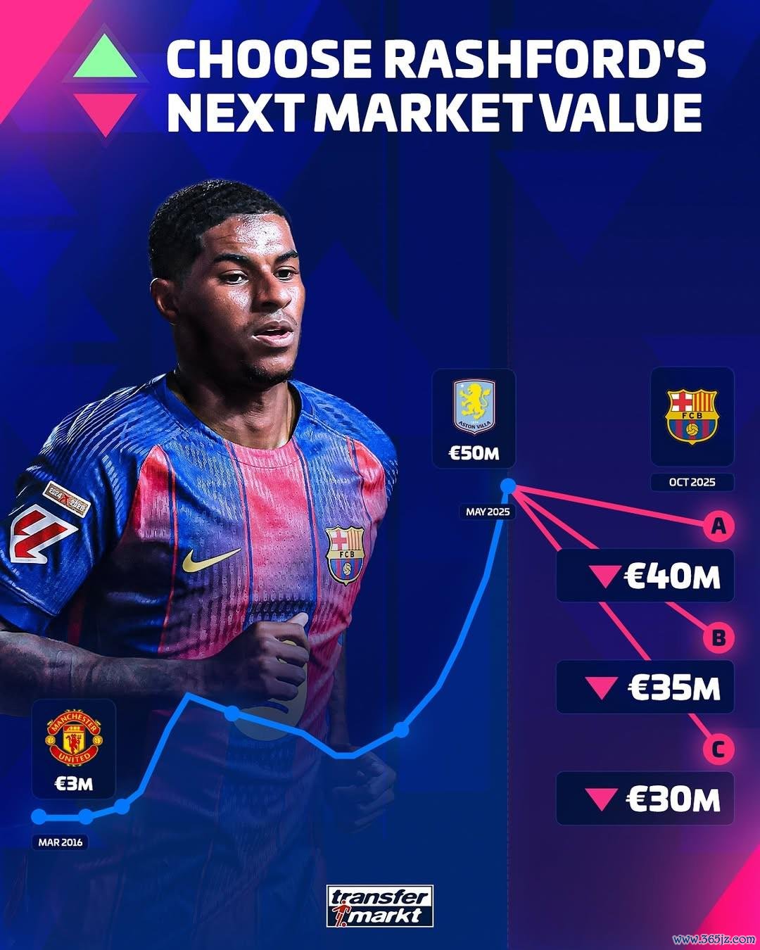 当今拉什福德的身价为5000万欧元,说明德国转会商场透露的信息,他的身价将会下降,可能下降到4000万欧元、3500万欧元好像是3000万欧元。