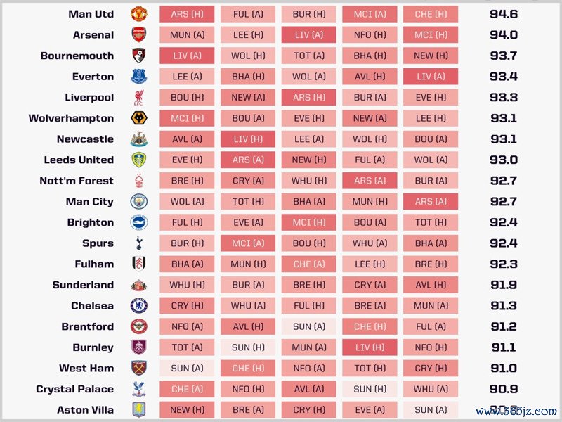凭证这套系统,曼联前五个敌手包括阿森纳、富勒姆、伯恩茅斯、曼城和切尔西,五个敌手的平均难度是最大的,高达94.6分,随后的阿森纳为94分,其中包括曼联、利物浦和曼城三个传统权门,最狂妄的是阿斯顿维拉,只须90.9分,五个敌手鉴识是纽卡斯尔、布伦特福德、水晶宫、埃弗顿和桑德兰。