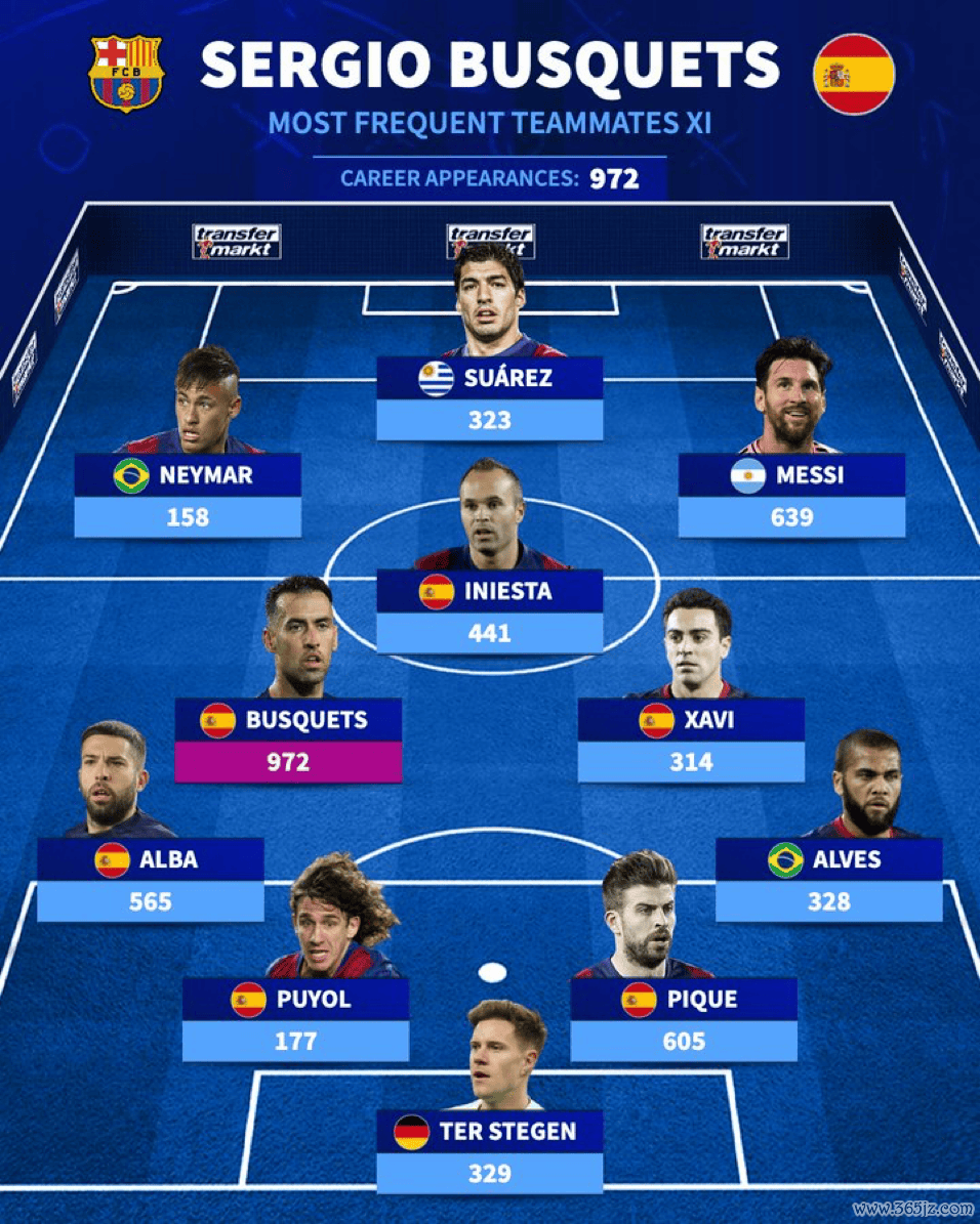 布斯克茨职业生计协作次数最多的队友: MSN领衔, 哈白在列