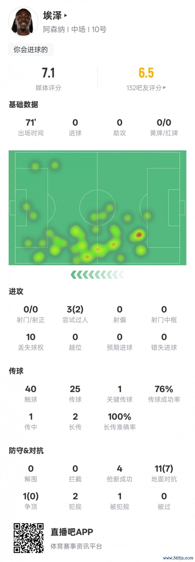 9月17日讯 欧冠联赛阶段第1轮,阿森纳客场2-0毕尔巴鄂竞技。埃泽首发出战,3次过东谈主2次奏效,送出1次过失传球,还有4次抢断,评分7.1。