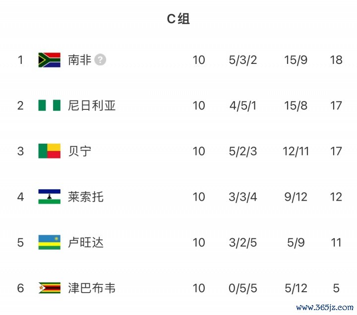 注:非洲预选最终4个收成最佳的小组第2将进行附加赛。因E组唯一五支球队参赛,是以在贪图小组第二位排行时,对同组第六名的两场赛事收成不被贪图。因此尼日利亚战平津巴布韦的交手记录不被计划在内。