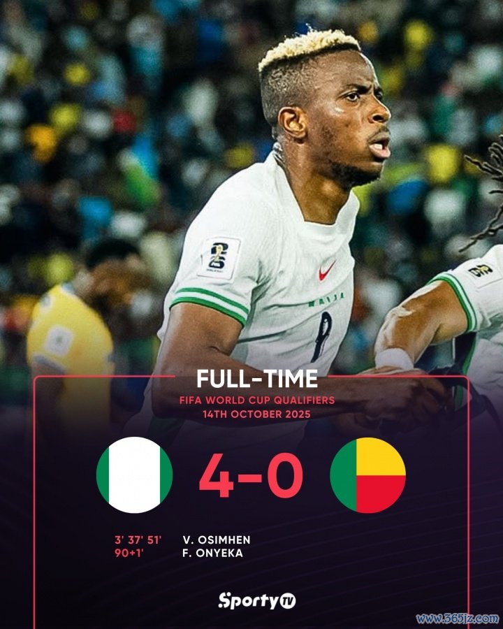 10月15日讯 世初赛非洲区小组赛C组,尼日利亚4-0贝宁,本场比赛奥斯梅恩戴帽,丘库埃泽助攻双响。