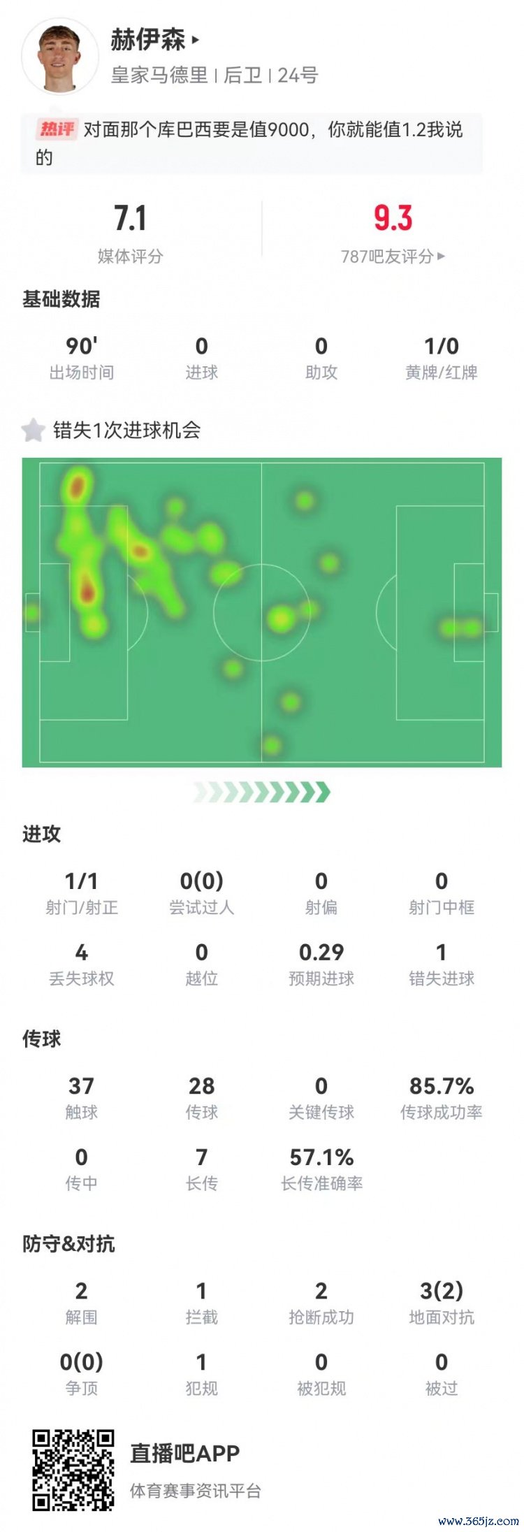 赫伊森本场1射1正1失良机 7长传4见效 2突围2抢断1禁绝 获评7.1分