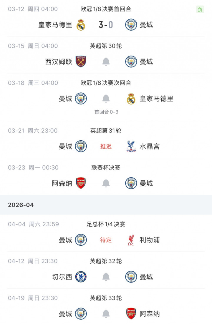 哈兰德的低迷状态以及打硬仗必定隐身的问题再一次害惨了瓜迪奥拉,曼城的魔鬼7场赛程遭遇当头一棒。曼城本周末英超客战保级球队西汉姆联,接着是下周中欧冠1/8决赛次回合对阵皇马,3球落后,拼还是不拼呢?瓜迪奥拉也是两难选择。两回合皇马之后,就是联赛杯决赛,曼城与阿森纳争冠;接着足总杯1/4决赛对阵利物浦,魔鬼赛程最后2场就是英超对阵切尔西和阿森纳的big6大战。
