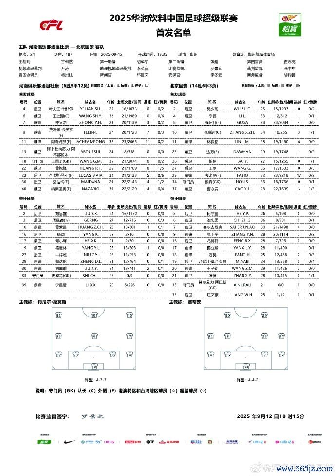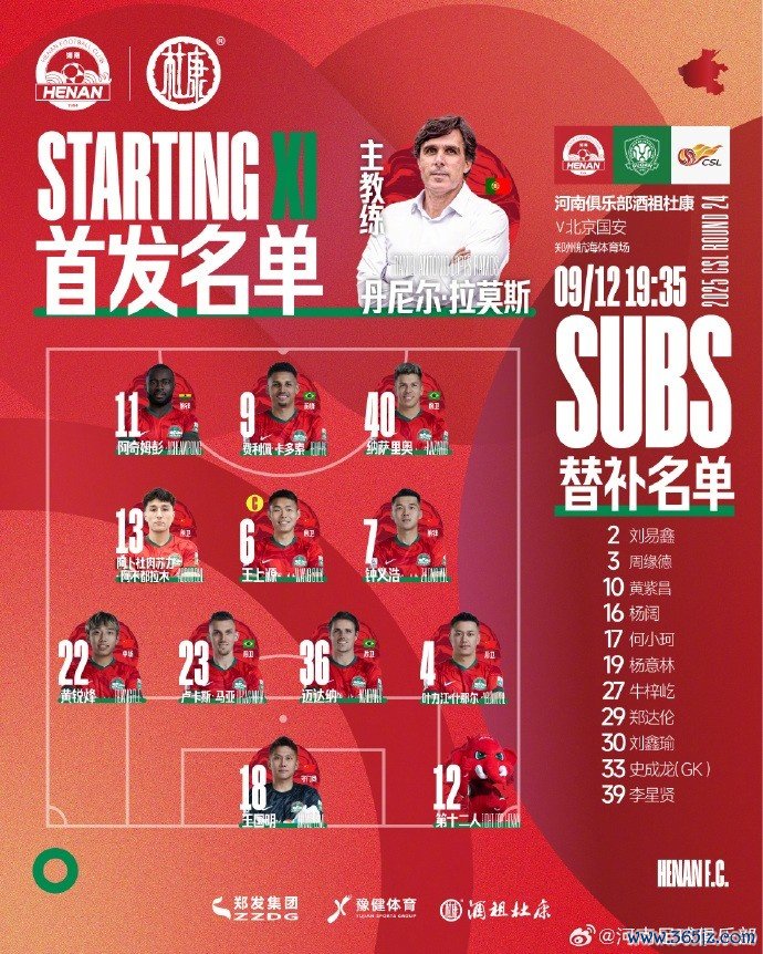 中超联赛第24轮,河南VS北京国安首发及替补队员名单