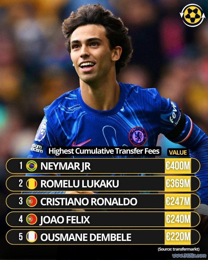 07月28日讯 在菲利克斯加盟利雅得收效后,他的糊口蓄积转会费将会卓越登贝莱,来到历史第4,仅次于内马尔、卢卡库和C罗。