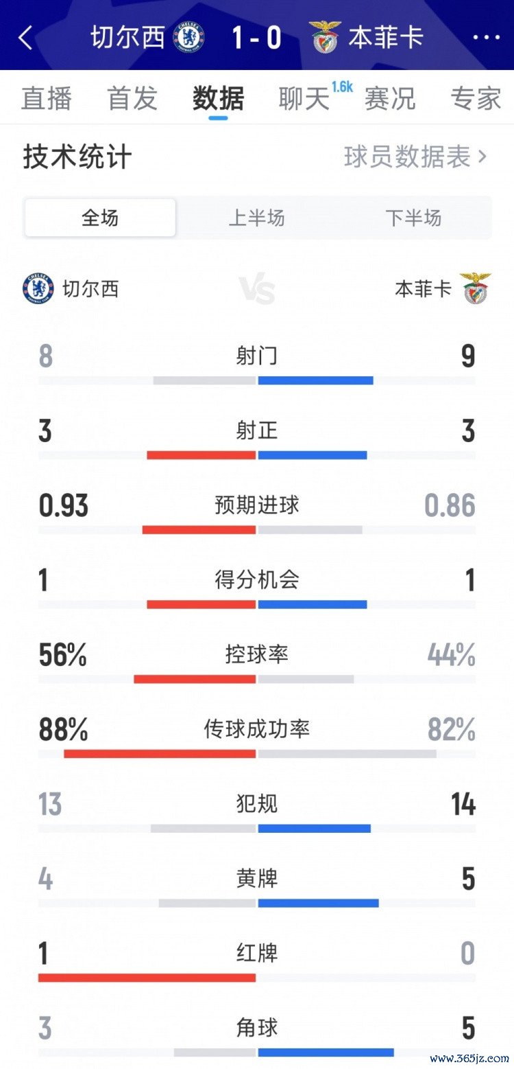 切尔西1-0本菲卡全场数据: 射正8-9, 射正3-3, 黄牌4-5, 红牌1-0