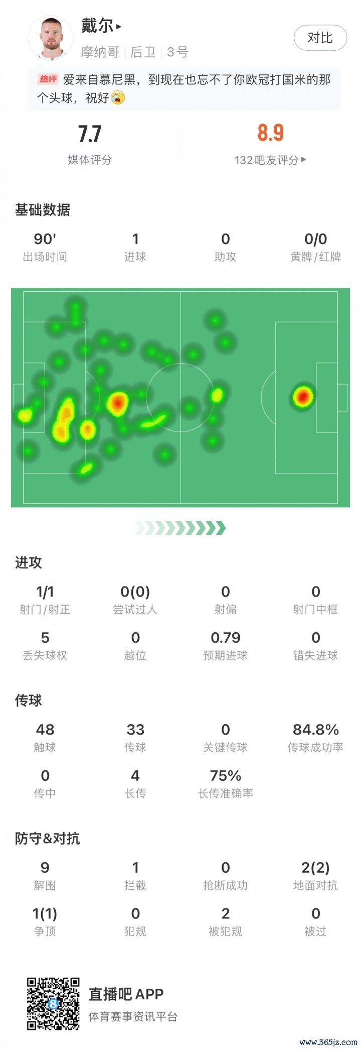 本场比赛,31岁的戴尔首发出战打满全场,媒体评分获评7.7分全队第1,戴尔此战9次突围1次阻碍,2次造反1次争顶一齐到手,他还造点并我方主罚射中。