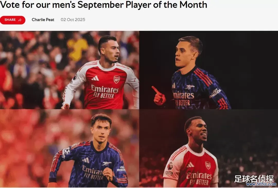 官方:马丁内利、特罗萨德、祖比门迪和加布里埃尔被提名为了阿森纳9月份队内最好球员候选。