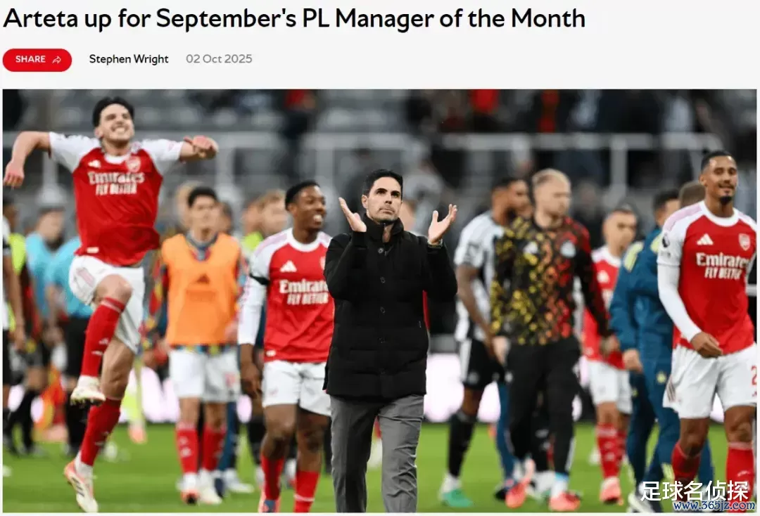 官方:阿尔特塔被提名为了英超9月份最好主帅候选。
