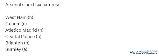 阿森纳畴昔6场比赛:主战西汉姆、客战富勒姆、主战马竞、主战水晶宫、主战布莱顿、客战伯恩利。