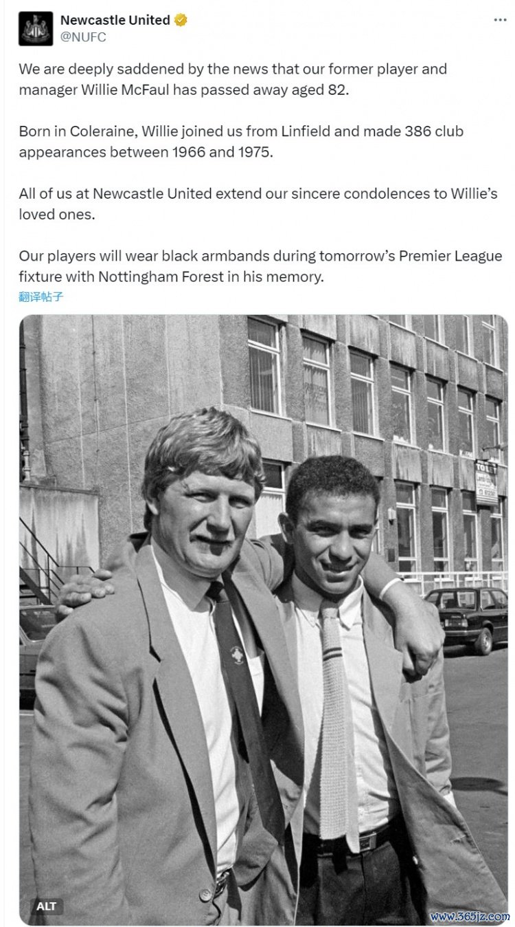 纽卡官方社媒写谈:“咱们深感哀痛地获悉,俱乐部前球员、西席威利-麦克福尔亏欠,享年82岁。威利出身于科尔雷恩,从林菲尔德转会加盟咱们,1966年至1975年间共为俱乐部出场386次。