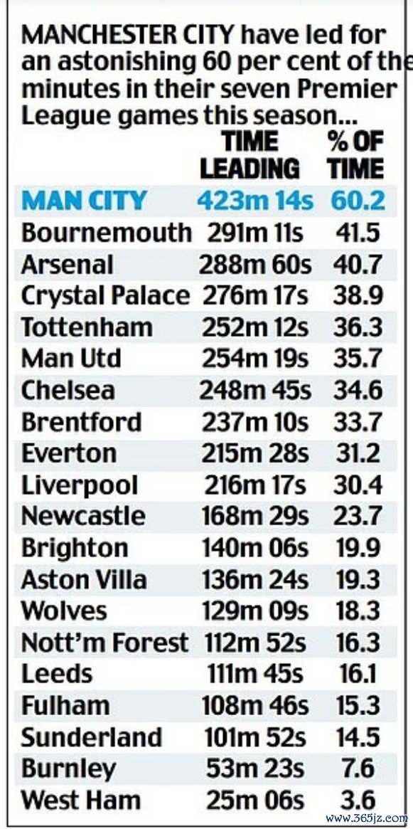 尽管现在在积分榜上只可位居第5,但曼城的跳跃本事达到了423分钟14秒,占总比赛本事的60.2%,伯恩茅斯、阿森纳和水晶宫是前四中的另外三支球队。曼联现在在积分榜上位居第10位,但他们在比赛中的跳跃本事不错在20支球队中位居第5。