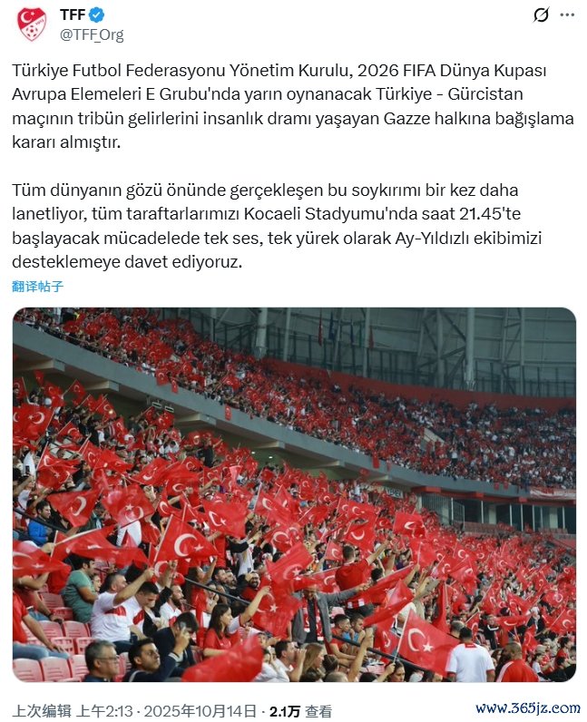 土耳其足协董事会决定,将未来举行的土耳其对阵格鲁吉亚比赛的门票收入捐馈遗遭逢东谈主谈目的倒霉的加沙东谈主民。