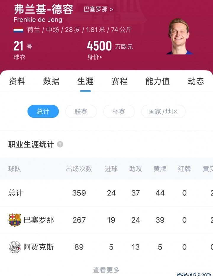 德容2019年以8600万欧转会费从阿贾克斯加盟巴萨,于今为巴萨出战267场比赛19球24助。