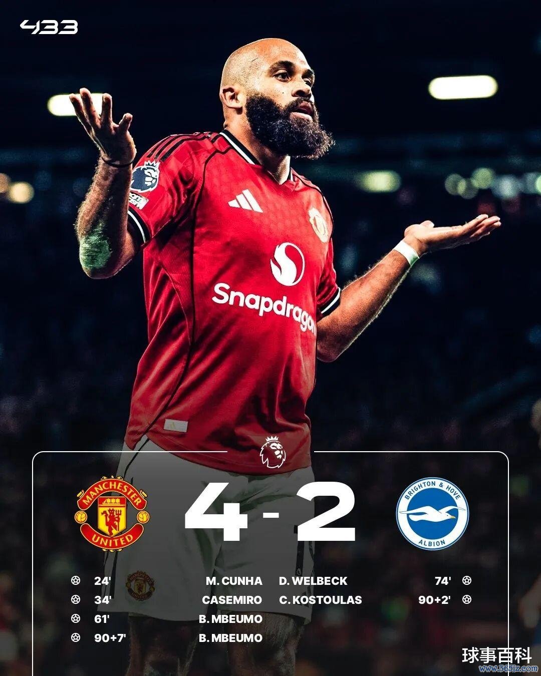 下半场开动后,谢什科接长传球后传球给姆贝乌莫,后者为曼联打入了本场比赛的第三球。前曼联青训球星维尔贝克通过一记精彩的落拓球为客队扳回一球。比赛干预补时阶段,查阿拉姆波斯·科斯托拉斯头球破门,为布莱顿带来了临了的但愿,但姆贝乌莫在临了时刻梅开二度为曼联4-2锁定了胜局。