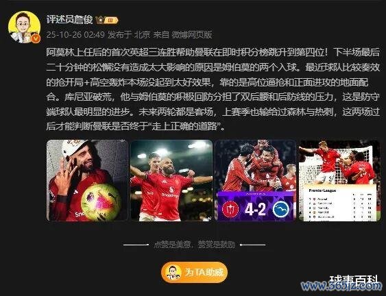 北京时期10月26日,英超第9轮比赛,曼联主场4-2打败布莱顿,豪取三连胜,暂居英超第4位。研讨到布莱顿在客场仍是连赢3次曼联,这场比赛一开动两边就伸开了浓烈的控球争夺,布莱顿试图诱使曼联压上,而阿莫林的球队则坚合手长传战略。20分钟后,库尼亚为红魔首开记载,打入曼联糊口首球。粗略15分钟后,卡塞米罗通过一记远射折射破门,将比分扩大为2-0。