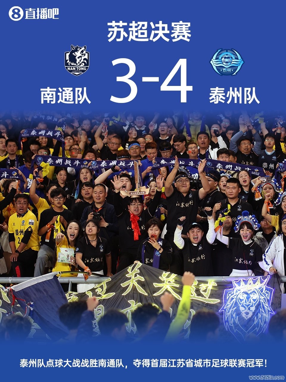 11月1日讯 苏超决赛,泰州队点球大战4-3打败南通队,问鼎首届苏超冠军。赛后,滂湃江苏发文恭喜泰州队夺冠。